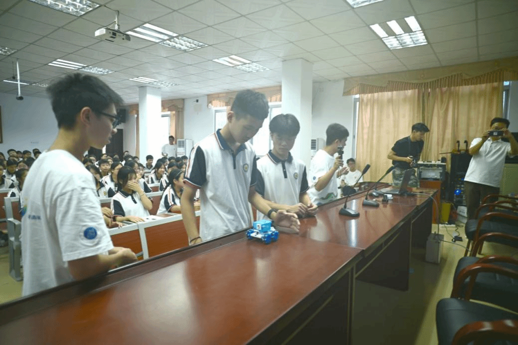 原理讲解后,学生们在队员指导下近距离观察智能小车运行:超声波传感器实时探测障碍,小车精准执行指令,零距离感受“代码驱动世界”的神奇转化。队员们适时引导,掌握超声波测距与逻辑判断,并描绘了物联网互联万物、云计算赋能学习、AI重塑未来的壮阔图景,激励学生“用代码编织智慧世界”。