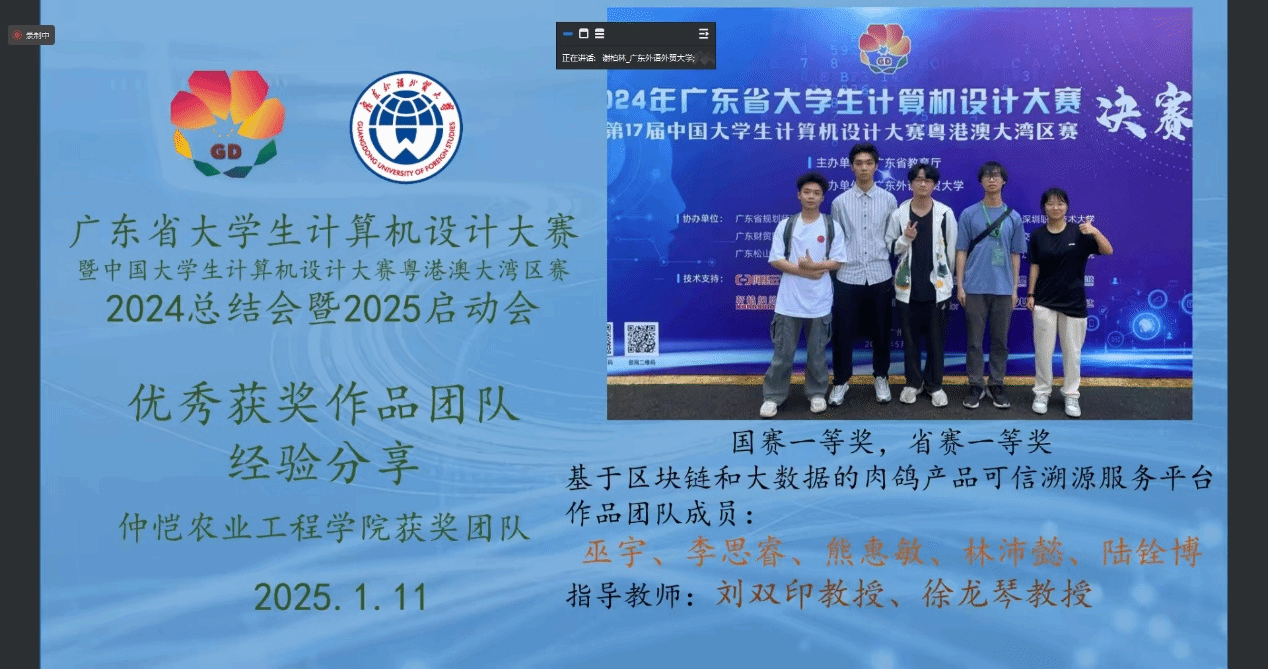 1月11日,广东省大学生计算机设计大赛2024年总结会暨2025年启动会顺利召开,本次会议由广东省教育厅主办、广东外语外贸大学承办,广东省教育厅高教处科长张兵,大赛组委会副主任王常吉教授、组委会副秘书长李宇耀博士,协办院校代表、各参赛队伍指导教师代表及参赛学生代表近300人参会,我校信息科学与技术学院“基于区块链和大数据的肉鸽产品可信溯源服务平台”项目团队作为优秀作品获奖团队受邀作经验分享。