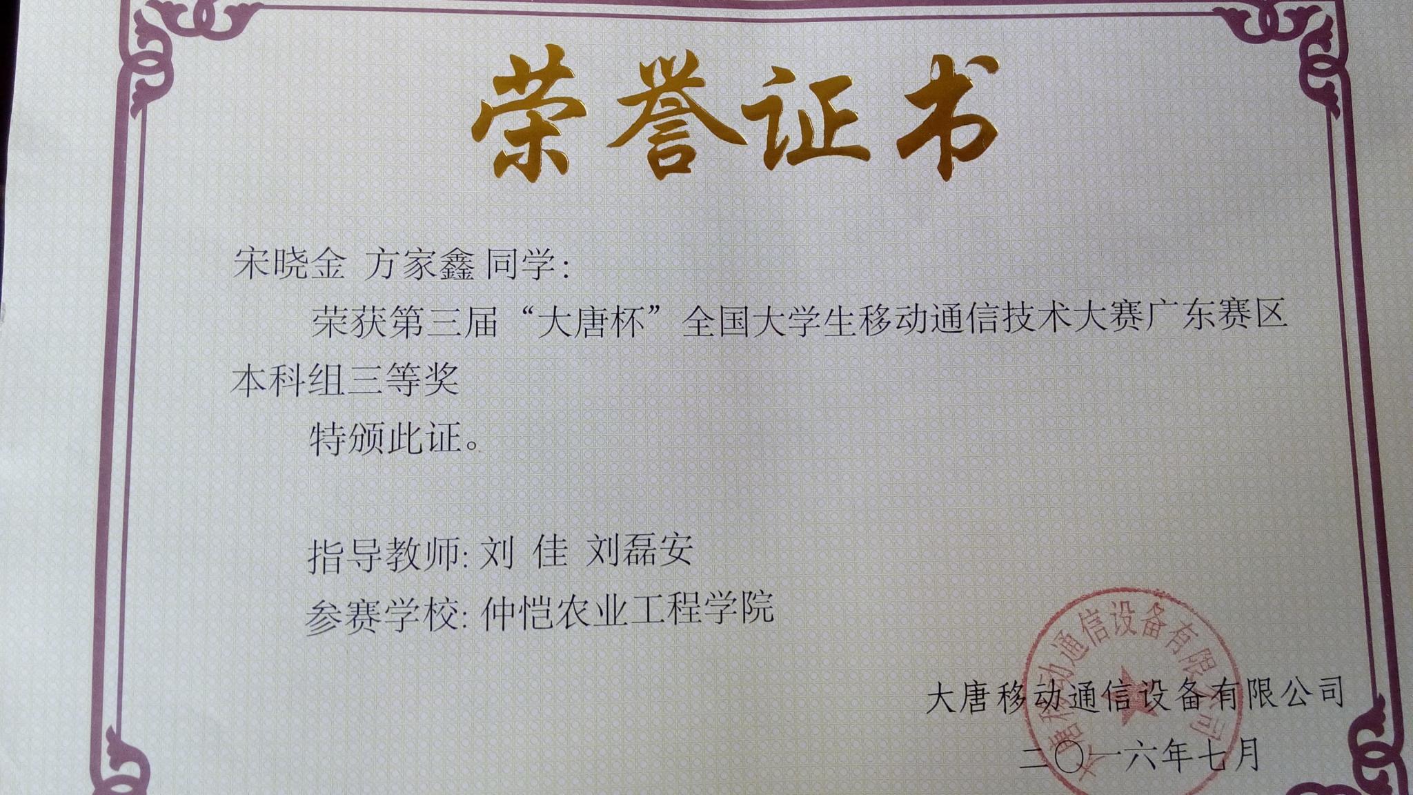 第三届“大唐杯”全国大学生移动通信技术大赛广东赛区本科组三等奖