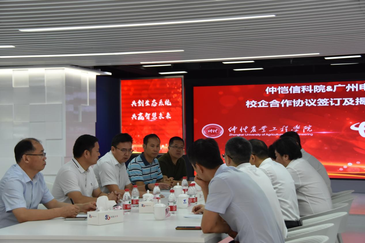 中国电信广州公司副总经理张晖对宋垚臻书记一行到访表示热烈欢迎,介绍了中国电信的电信天翼云、大数据、物联网、视频监控、高性能计算、智慧校园和虚拟实训等信息化技术,并期望在智慧农业等方面与我校开展全方位共建共赢。