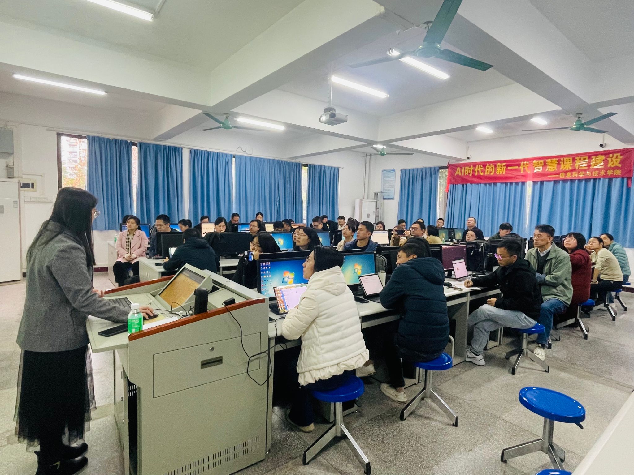 在大力推动教育智能化发展的背景下,为切实提升教师的人工智能素养,信息科学与技术学院于12月25日上午9点在英东楼513成功举行了一场以“AI时代的新一代智慧课程建设”为主题的培训。本次培训由超星集团培训讲师童婉靖主讲,学院院长刘双印、教务部副部长胡燕红、学院教学副院长郑建华以及60多位专任教师参会。