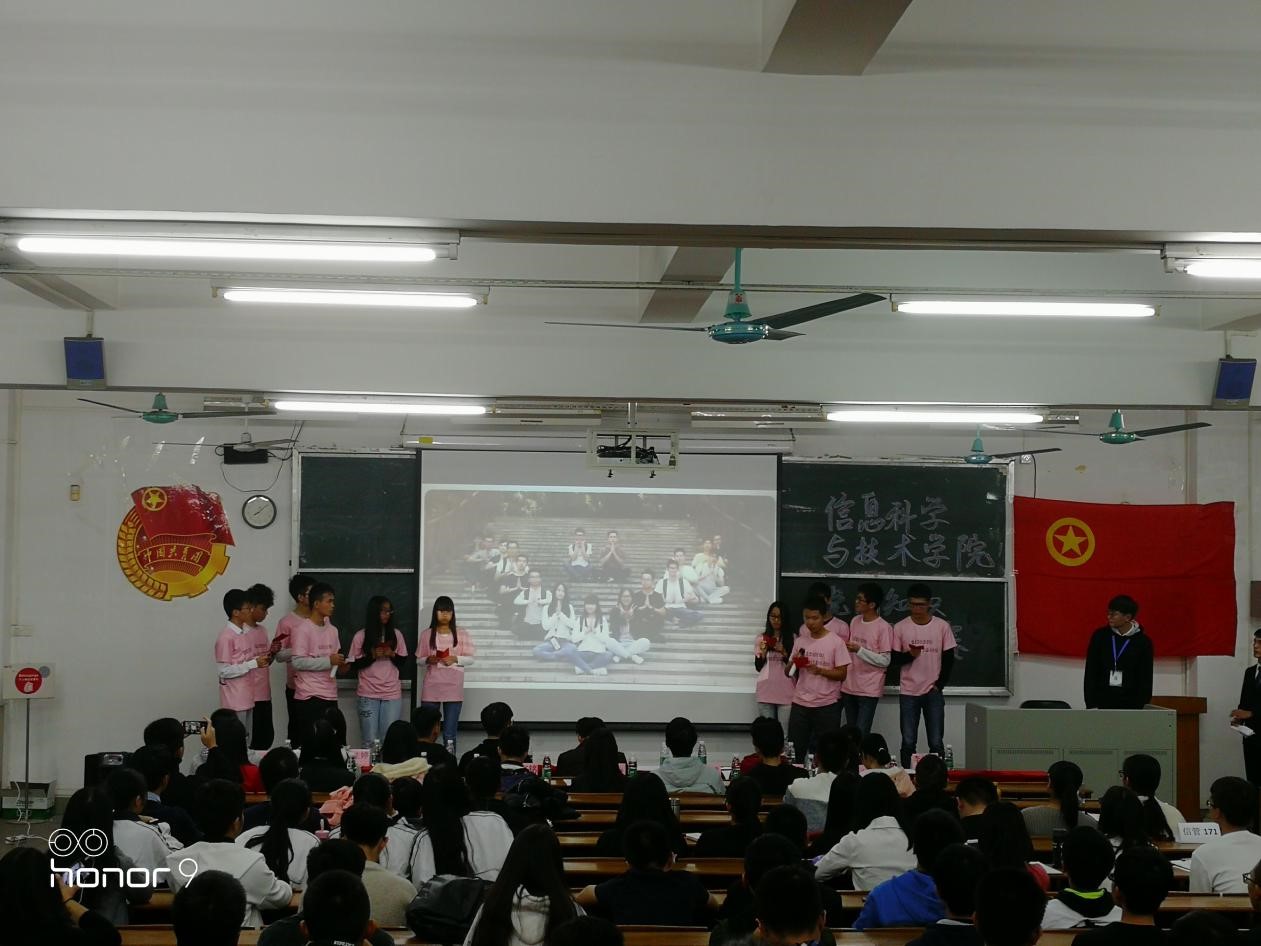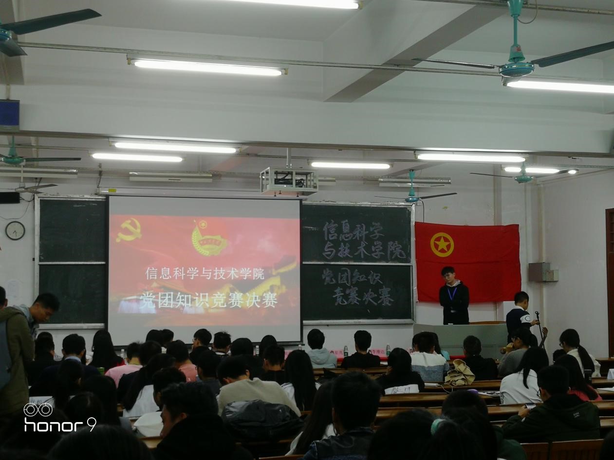 2017年11月25日晚,信息科学与技术学院在海珠校区教学楼B401教室举行了2017年党团知识竞赛决赛。出席活动的嘉宾有信息科学与技术学院党总支副书记王浩,团务中心组织部副部长黄佳婷、分团委第一副书记傅健、分团委第二副书记彭勇、学生会副主席任星亮,参与此次会议的还有各兄弟学院代表及分团委各部门代表和各班同学。