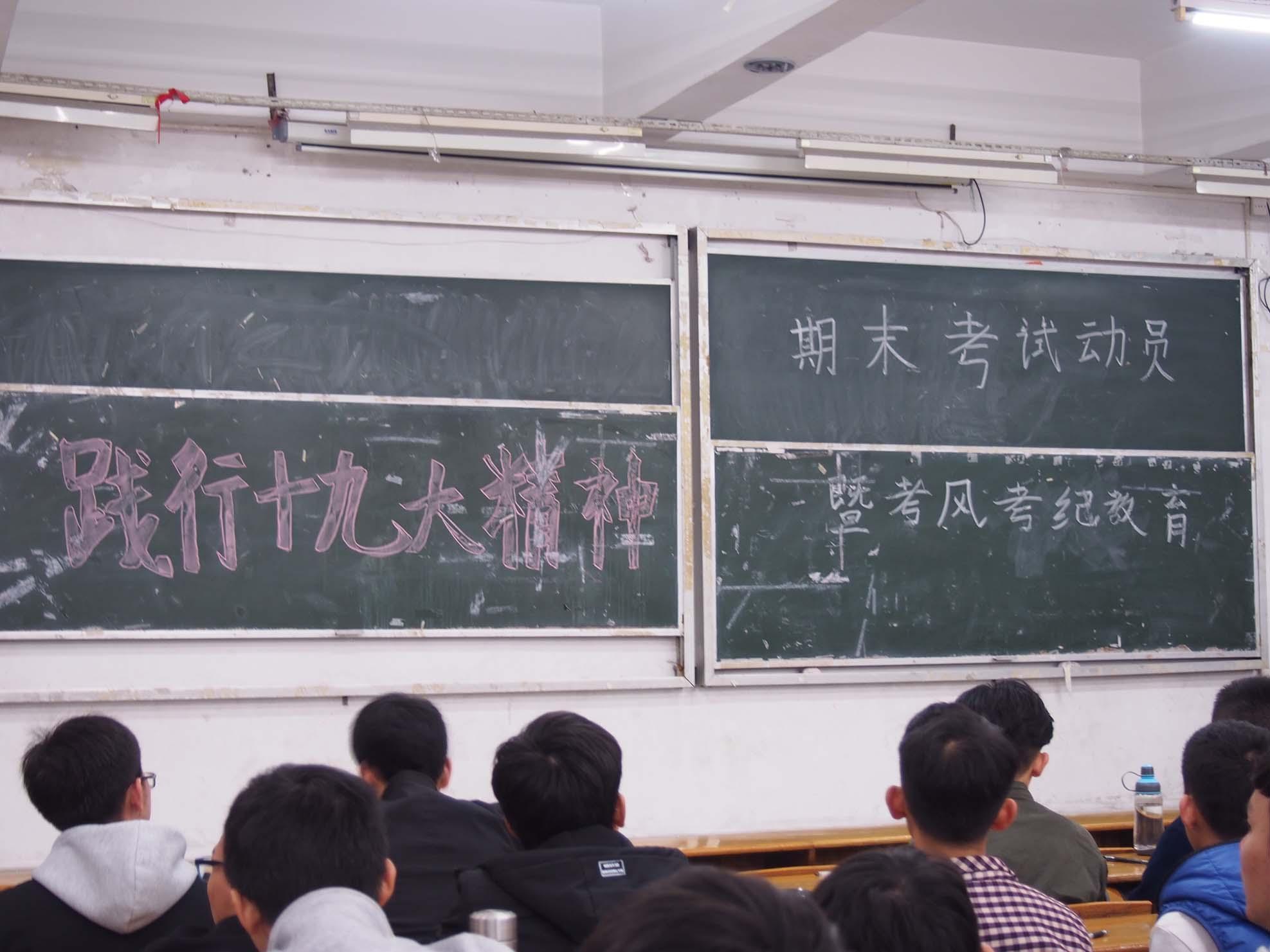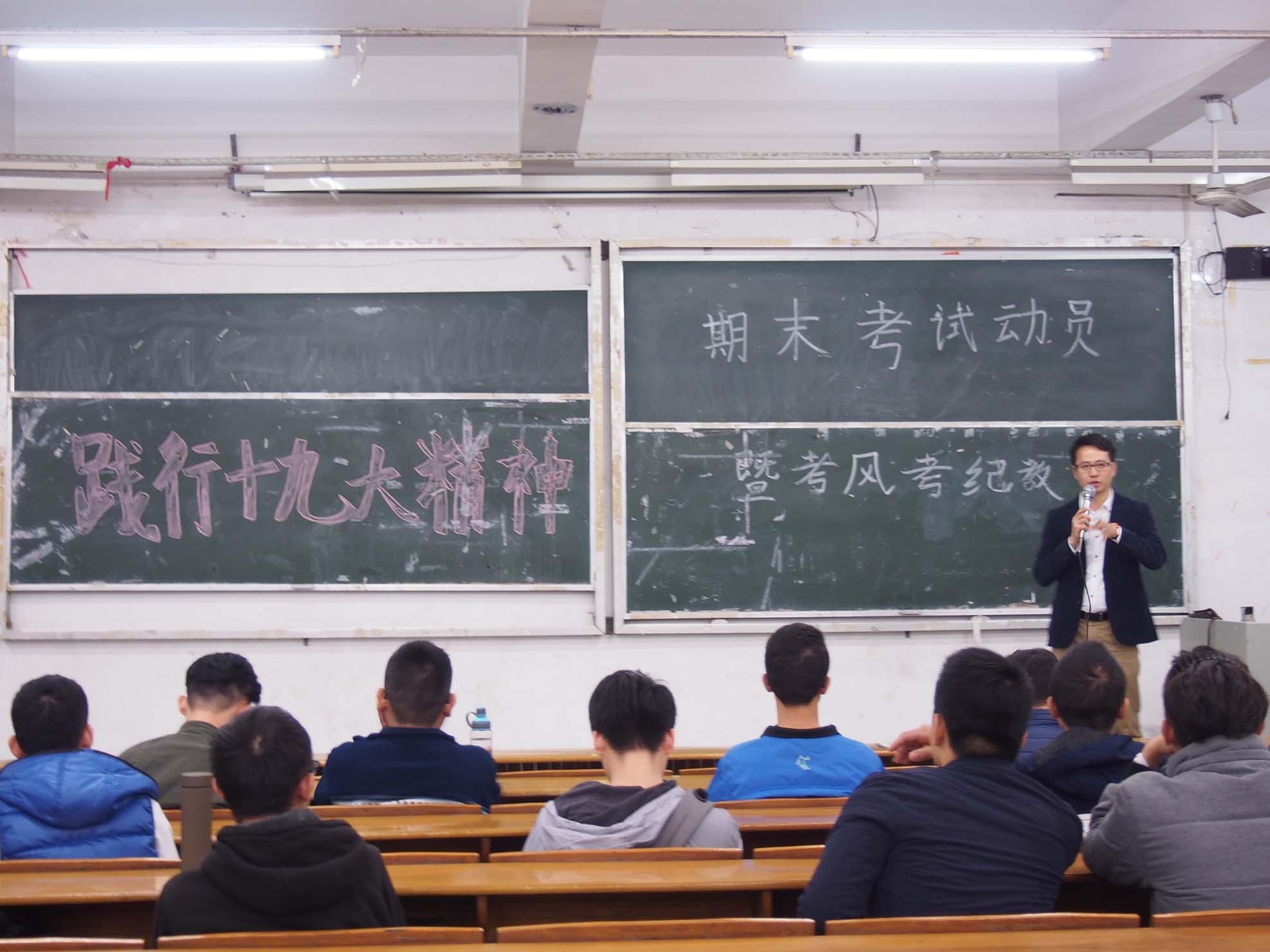 2017年12月13日晚上信息科学与技术学院辅导员吴南生老师在教室B301举行关于考风考纪的短暂会议。