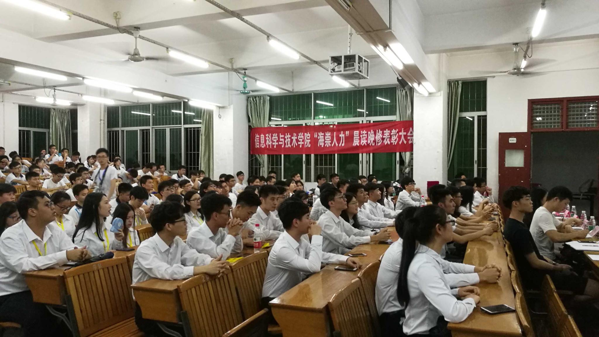 6月22日,信息科学与技术学院在教学楼B301举办2017-2018学年“海崇人力”晨读晚修学风建设表彰大会。学院党总支书记吴家培、副书记王浩,广州市海崇人力资源服务有限公司副总经理谢海珊,学院辅导员吴南生,以及学院团学骨干200余人参加了会议。会议由吴南生主持。