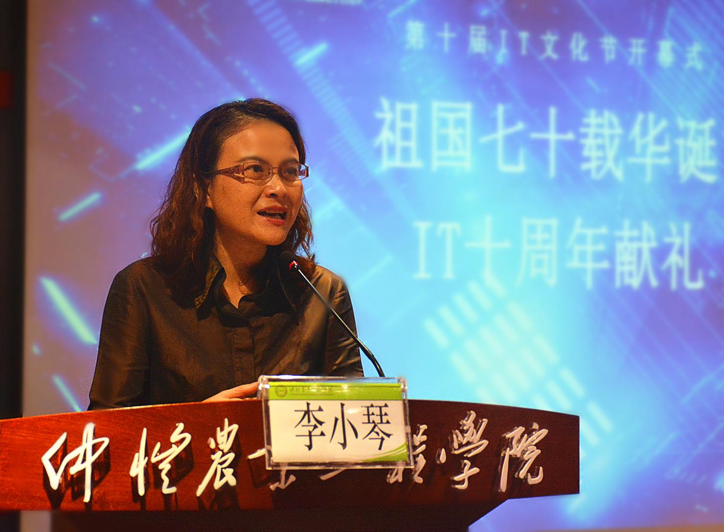 副校长李小琴致开幕辞,她提到,今年是中华人民共和国成立七十周年、《粤港澳大湾区发展规划纲要》正式出台的重要年份,也是国家大力推动创新创业之际。在乡村振兴的大背景下,大学生拥有着前所未有的发展机遇,因此今年第十届的IT文化节将具有更加特殊的意义。她提到,本届IT文化节的主题是:“祖国七十载华诞,IT十周年献礼”,希望同学们能够做到:崇尚科学,对科学保持浓厚的好奇心;勇于创新,主动参与和体验,在实践中积累经验,增长才干;要有家国情怀,将个人进步与国家发展联系起来,为中华民族伟大复兴中国梦的实现而奋斗。最后,她预祝本届文化节取得圆满成功。