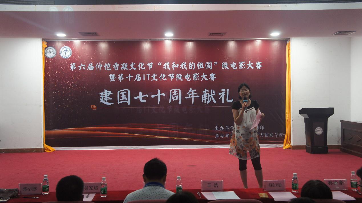 5月23日晚,由校党委宣传部主办,信息科学与技术学院承办的第六届仲恺香凝文化节“我和我的祖国”微电影大赛暨第十届IT文化节微电影大赛在学术报告厅举行,献礼祖国七十华诞。校党委宣传部部长曾献尼、信息科学与技术学院党总支书记吴家培、党委组织部副部长王浩、校报编辑部主任郭小娜、微电影指导老师梁瑜、辅导员刘卓以及学生干部代表出席。
