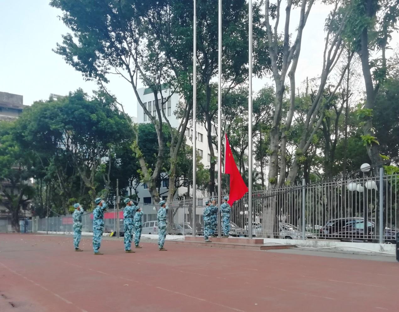 上午7时,升旗现场安静肃穆,在全体师生的注目下,英姿飒爽的国旗护卫队护送鲜艳的五星红旗进场,伴随着庄严的《中华人民共和国国歌》,五星红旗冉冉升起,迎风飘扬。现场的每一个人都饱含深情,目光中透出对祖国无限的热爱和崇高的敬意。