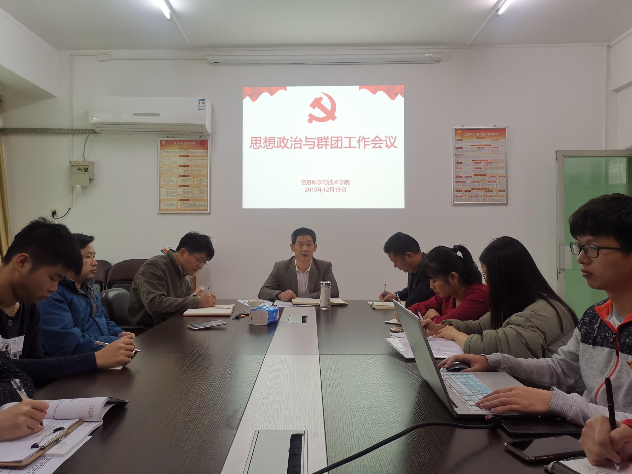 12月19日,m88思想政治和群团工作专题会在教学楼东312召开,学院党总支书记吴家培主持会议并作主题讲话,学院党总支副书记史孔仕、工会主席刘磊安、工会委员李晟、学院全体辅导员、团委和学生会主要负责人参加了会议。