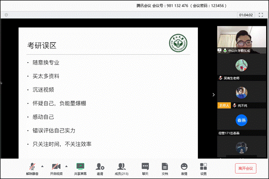 为加强低年级学生对考研的了解,激发他们的报考热情,营造积极向上的学风,学院于3月20日在腾讯会议上举办了考研经验交流和动员会。交流会邀请了m88毕业的中山大学在读研究生赖东成,他结合自己的经历给同学们分享了自己的考研心路历程和在备考期间应注意到的问题,包括提前确定目标院校、坚持自己选的专业,以及考研心态上的调整。交流会持续在线人数213人。