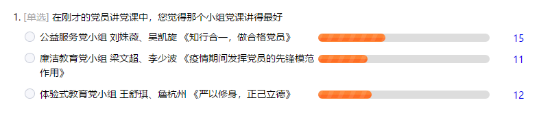 “点亮思想,擦亮形象”党员讲党课比赛活动按计划将分季度进行。该党支部有三个党小组,每季度每个党小组各派代表选取专题制作党课PPT并讲授党课,每次由现场听课正式党员在易班课群进行投票,年底四个最佳小组再进行PK,最后评出一二三等奖。经投票,本次比赛由公益服务党小组派出的刘姝薇和吴凯旋以15票出线,将参加年度比赛。