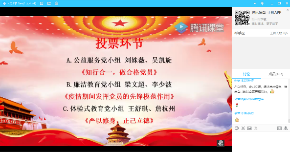 为了切实做到“党的课程上线、党的活动在线、党员意识不离线”,进一步落实以“云”育人党建工作,m88学生第二党支部把党的组织生活搬上云端,于2020年4月30日利用腾讯课堂开展主题为“点亮思想,擦亮形象”的“党员讲党课”比赛党日活动。支部书记邓艳桃、副书记田旭峰,全体党员及积极分子全员参与。