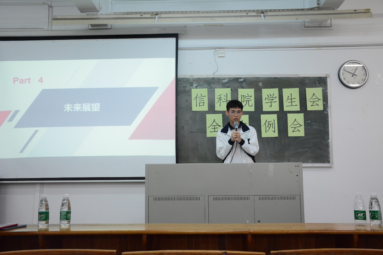 各部门汇报完毕,学生会执行主席蓝东盛上台,他总结了本学期学生会开展的各项工作,指出了目前学生会中暴露出来的一些问题,强调接下来要重点在部门对接、沟通,集体组织力和效率提升等方面进行改进,最后对下学期的工作展望进行了汇报。