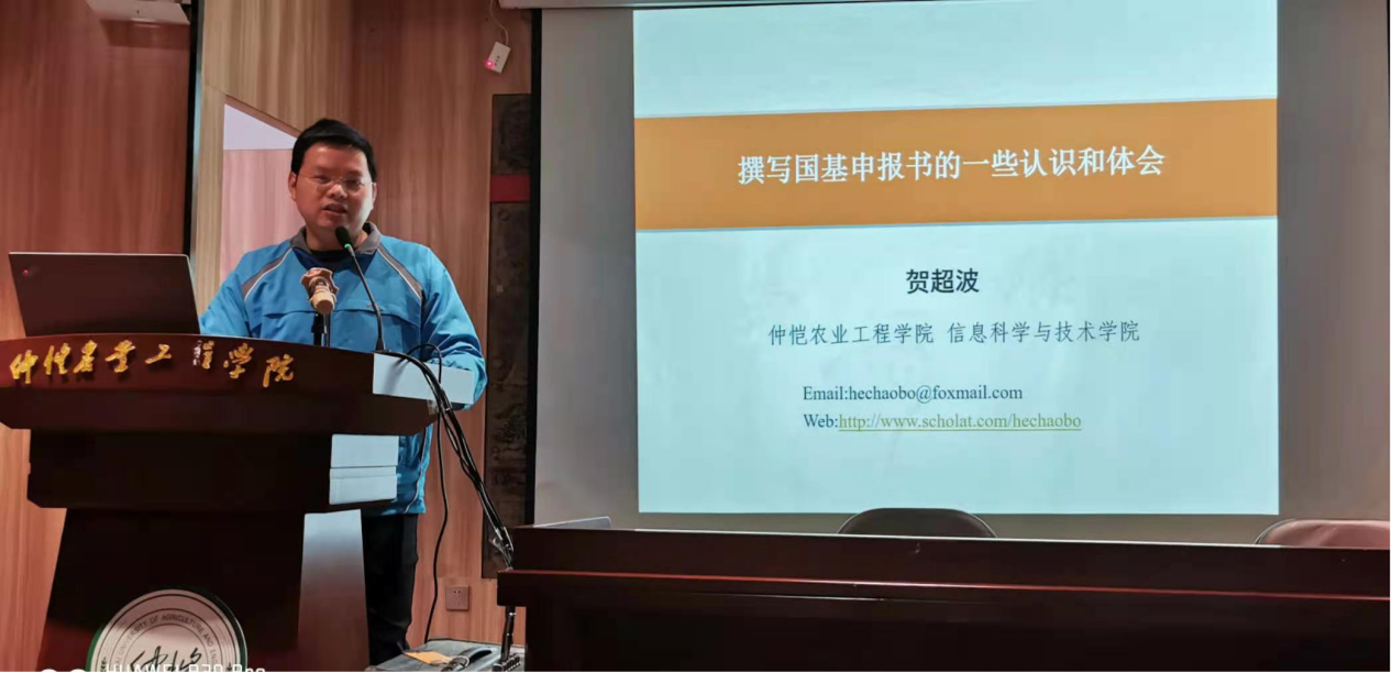 贺超波教授的主讲题目是“撰写国基申报书的认识和体会”,他分别从项目命名、选题领域、科学问题属性、项目立项依据、研究目标、拟解决的关键科学问题、技术路线、可行性分析、创新之处、年度研究计划、预期成果、研究基础、团队成员等方面进行了详细的讲解,分享了在撰写申报书过程中的相关注意事项和考虑。