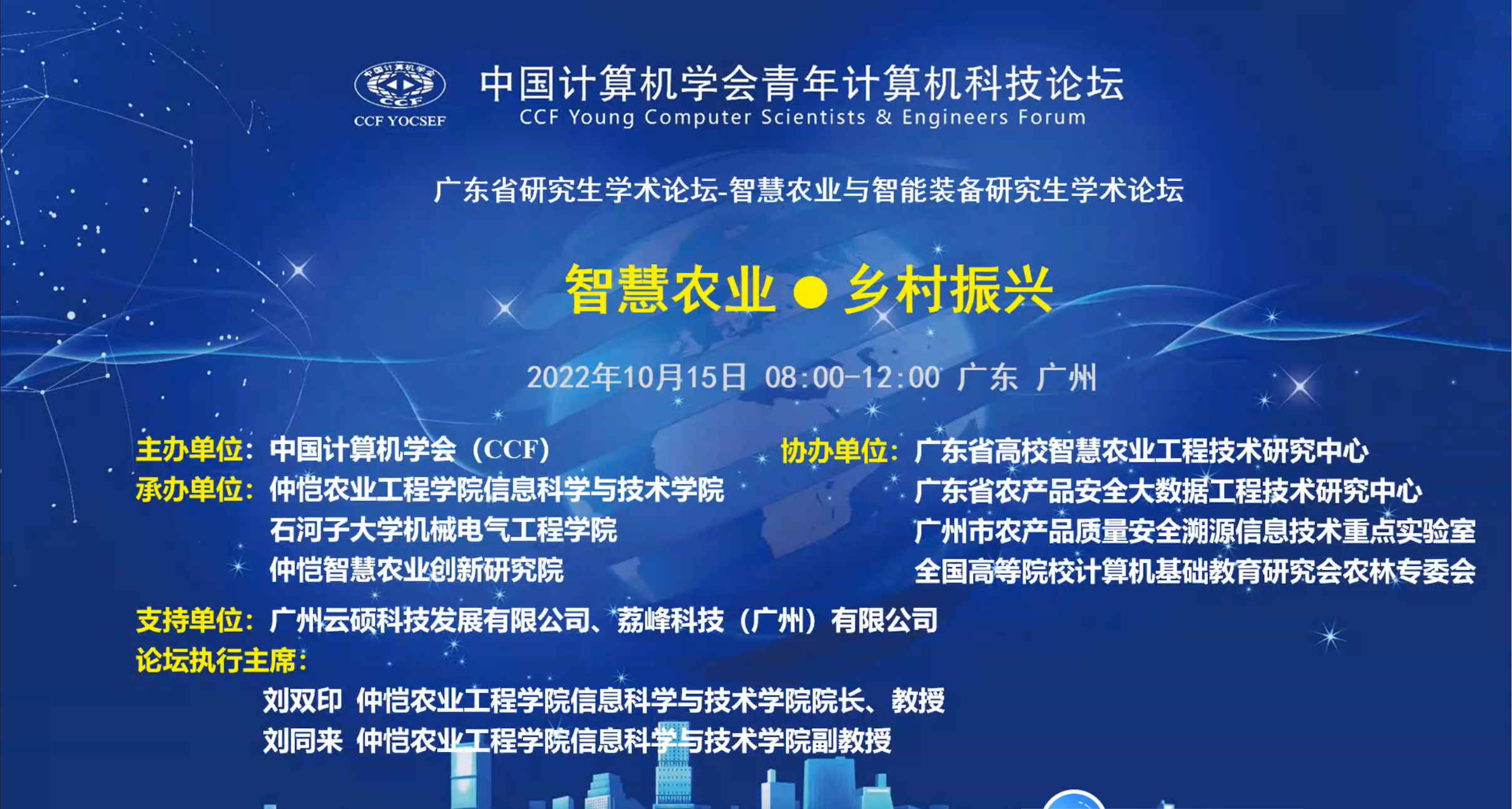 此次论坛由中国计算机学会(CCF)主办,m88,m88信息科学与技术学院、华南农业大学数学与信息学院、石河子大学机械电气工程学院、仲恺智慧农业创新研究院共同承办,广东省高校智慧农业工程技术研究中心、广东省农产品安全大数据工程技术研究中心、广州市农产品质量安全溯源信息技术重点实验室和全国高等院校计算机基础教育研究会农林专委会协办。m88,m88信息科学与技术学院院长刘双印教授和刘同来副教授担任“智慧农业乡村振兴”论坛执行主席,YOCSEF广州主席黄栋(华南农业大学)和YOCSEF广州AC委员刘同来副教授(m88,m88)担任“智慧农业技术生态:如何打通从技术到生态的任督二脉?”论坛执行主席。广州云硕科技发展有限公司和荔峰科技(广州)有限公司为此次活动提供了赞助支持。