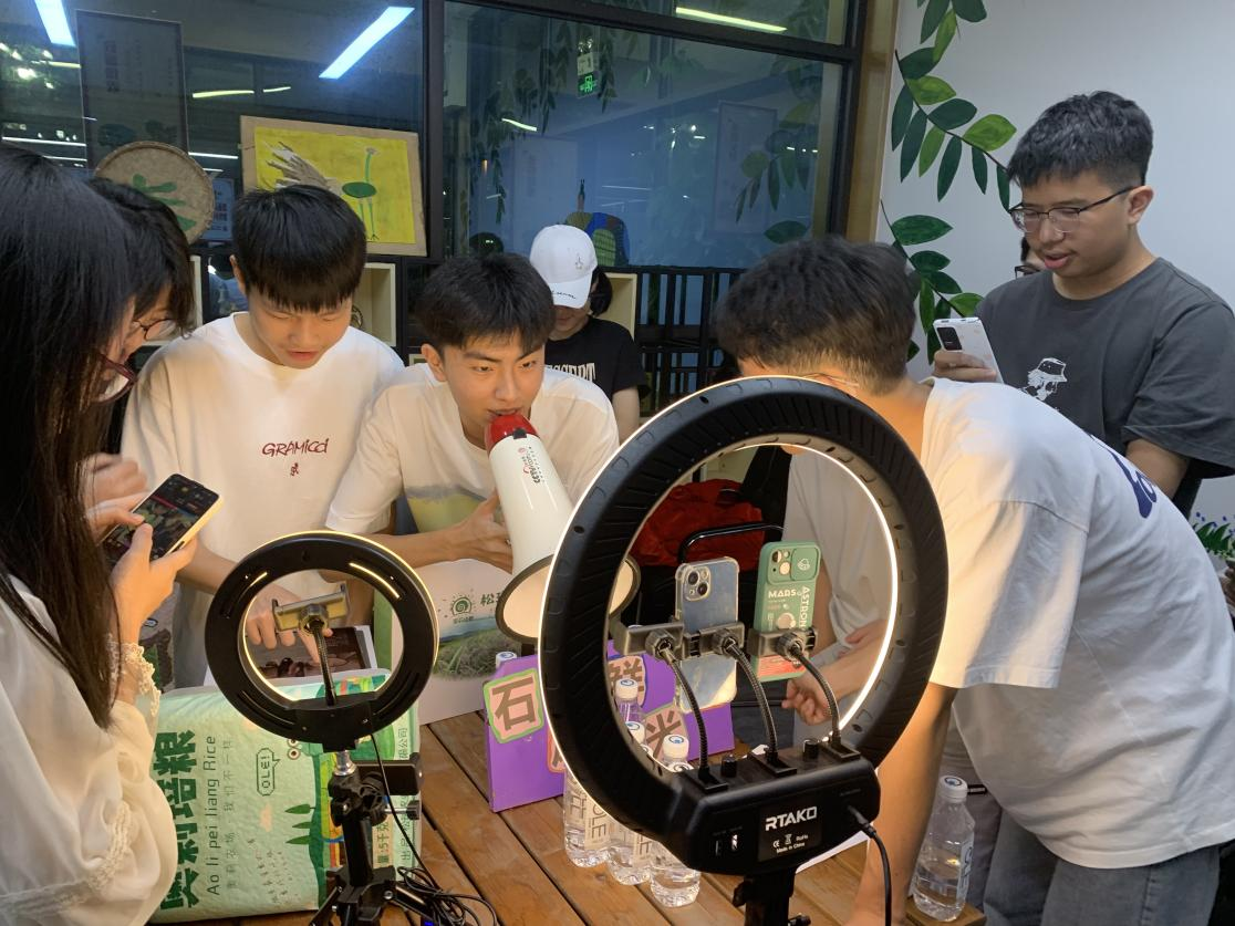 活动期间,学生们还观看了幸福村乡村振兴专题视频、万众创业电影等教育影片,并和当地的农民、村干部深入交流与学习,发放调查问卷,获取一手调研资料。近年来,直播电商等数字化商业模式成为赋能乡村振兴的重要方式。在农场老师的指导下,同学们学习直播运作、编辑话术,一手策划直播方案,开展农产品直播带货活动,在提高自身实操能力的同时为当地乡村振兴贡献一份力量。