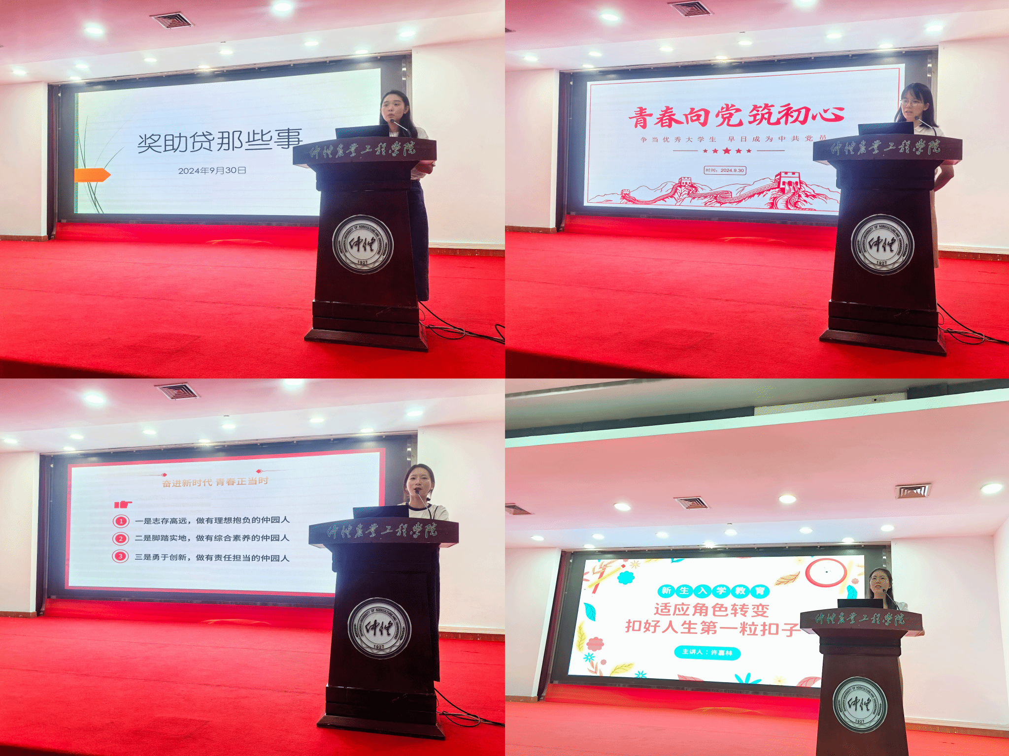 易洋以《青春向党筑初心》为题,系统开展新生入党启蒙教育,鼓励新生积极向党组织靠拢;钟翠以《奋进新时代 青春正当时》为题,鼓励依然是群众身份的新生积极申请入团,做有理想抱负、有综合素养、有责任担当的仲园人;张裴丹以《奖助贷那些事》为题,讲解大学可申请的奖学金项目和家庭经济困难学生可申请的奖助学金和助学贷款,鼓励同学们勇于逐梦;许嘉林作为新生辅导员以《适应角色转变,扣好人生第一粒扣子》为题,系统开展适应性教育、校纪校规教育、网络思政教育和职业生涯规划教育,引导新生快速适应大学生活,以积极、乐观、进取的精神面貌开启人生新篇章。
