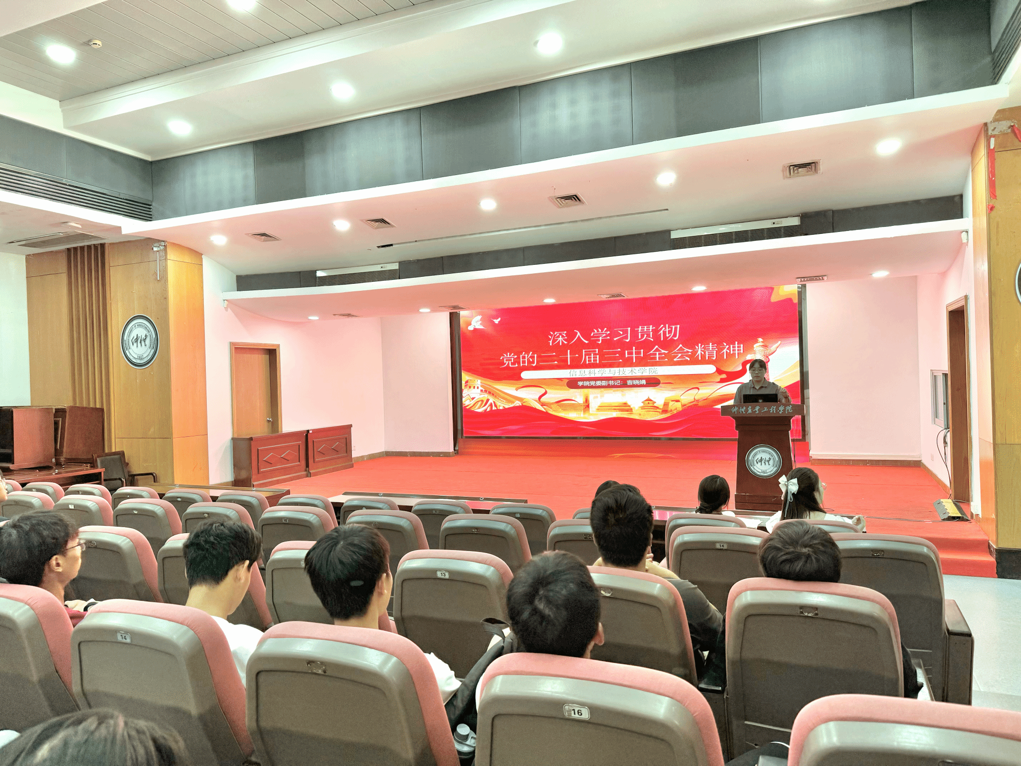 吉晓娟以《深入学习贯彻党的二十届三中全会精神》为题,从三个方面传达党的二十届三中全会精神。一是进一步全面深化改革,推进中国式现代化的重大意义和总体要求;二是从经济、政治、文化、社会、生态文明、国家安全、国防和军队等方面部署改革;三是加强党对改革的领导、深化党的建设制度改革、党风廉政建设和反腐败斗争。引导新生树立坚定的理想信念,明确大学学习生活方向和目标。