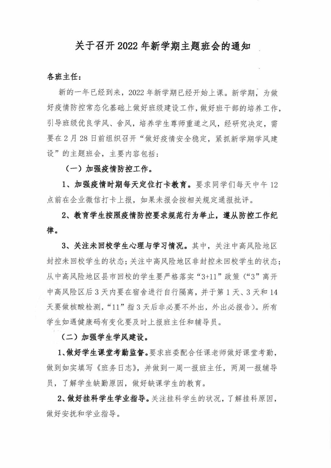 关于召开2022年新学期主题班会的通知