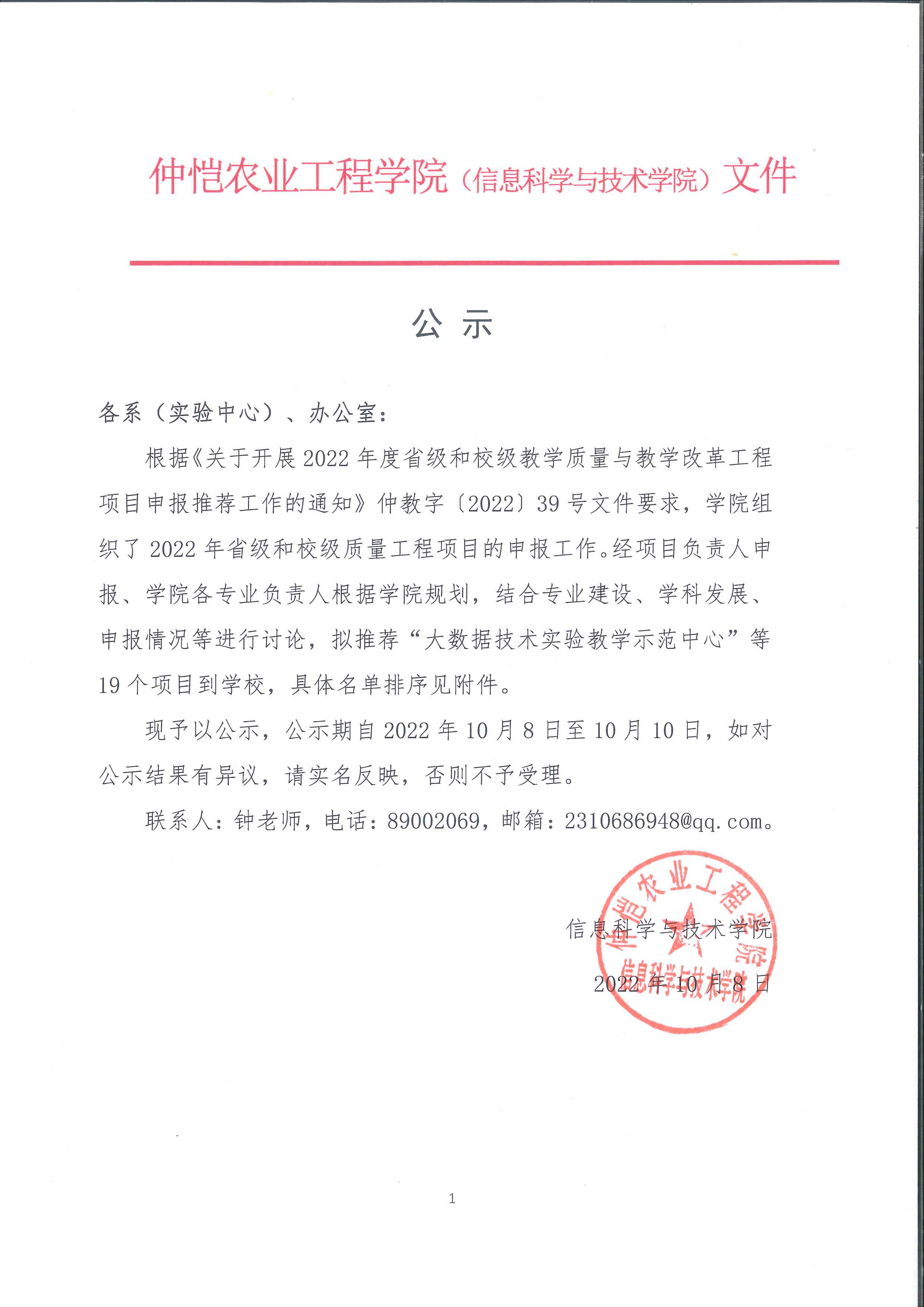 信息科学与技术学院关于2022年省级和校级质量工程项目拟推荐结果的公示